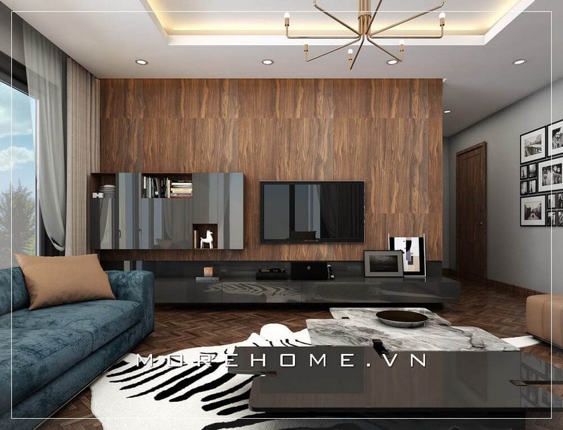 Trang trí nội thất phòng khách biệt thự đẹp sử dụng ốp gỗ tường sau ti vi tạo điểm nhấn nổi bật cho căn phòng